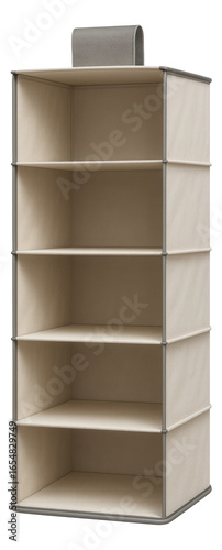 Hanging closet organiser with six canvas shelves and hook-and-loop strap