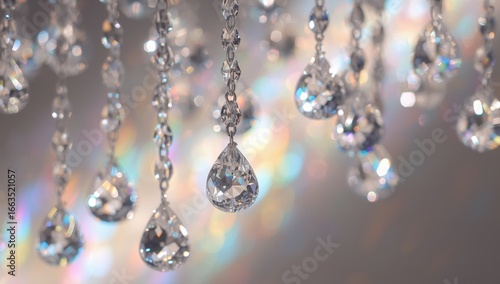 Hanging crystal chains scattering vibrant rainbow light with soft blurred bokeh background