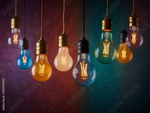 Hanging light bulbs with colorful backgrounds, symbolizing creativity.