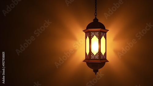 Hanging ornate lantern casting a gentle light suitable for festive Islamic designs with plenty of copy space for greetings and messages