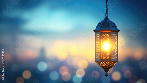 Hanging Ramadan lantern with intricate patterns glowing against a blurred city skyline and golden hour sky
