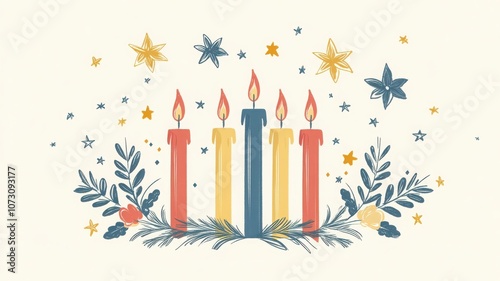Hanukkah blessing card in flat style, surrounded by stars and candles for sacred, joyful ambiance. Hanukkah