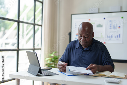 Happy African American businessman working with documents, preparing reports or marketing analysis, financial calculations. Working on a laptop computer online Contacting customers in a modern office