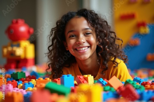 Happy African American girl with curly hair playing with colorful building blocks indoors, educational activity for kids, creativity, fun learning environment, bright playful background, childhood jo