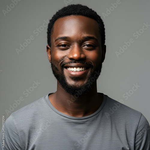 Happy African American man in casual gray t-shirt smiling broadly against a plain gray background. Portrait of a professional male model in a neutral setting.
