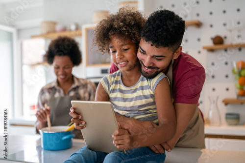Happy african family having fun with device at home. Black parents and child using digital tablet