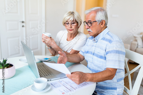 Happy aged husband and wife hold papers using laptop for online banking. Drinking coffee