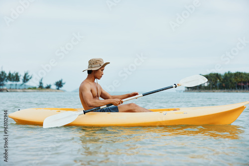 Happy Asian Man Enjoying Kayaking Adventure at Tropical Beach