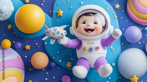 Happy baby astronaut in space with toy rocket, planets, and stars.
