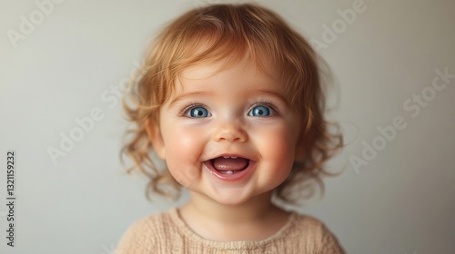 Happy Baby Girl with Blonde Curly Hair and Blue Eyes