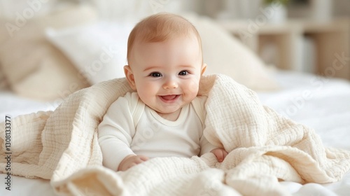 Happy Baby Smiling in a Cozy Neutral Bedroom Setting