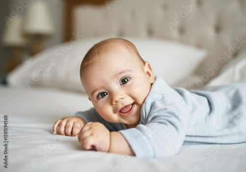 Happy baby smiling while lying on a soft bed, showcasing joy and innocence