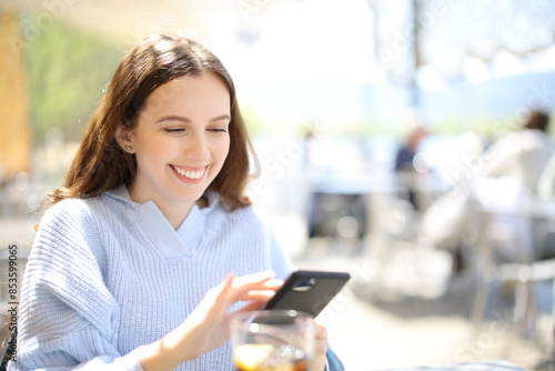 Happy bar customer checking cell phone