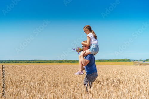 Happy beautiful father dad carries a little beautiful child girl on his shoulders, free time. Family entertainment in a wheat field
