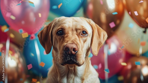 happy birthday day. dog, puppy with with surrounded by vibrant balloons and confetti. Bright, festive atmosphere.