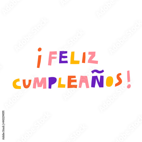 Happy Birthday message in spanish language. Cartoon fun lettering isolated on white. Cute hand drawn flat multicolored letters, colorful text vector illustration. Congratulation greeting card print