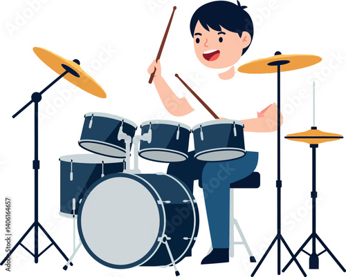 Happy boy playing drums in a flat, colorful style vector art