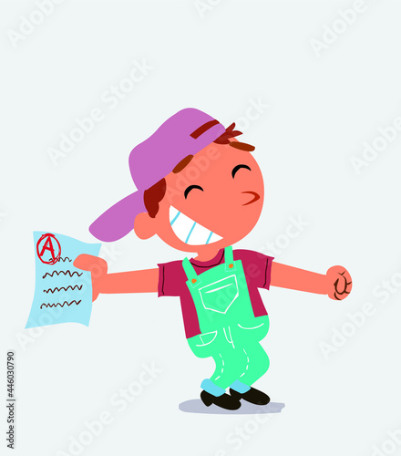 happy cartoon character of little boy on jeans rejoices with exam in hand
