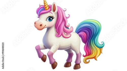 Happy cartoon unicorn with a colorful mane on a white background