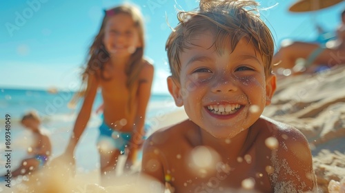 Happy child covered in sand at the beach.