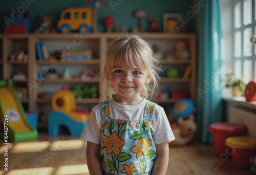Happy child smiling in a colorful playroom filled with toys