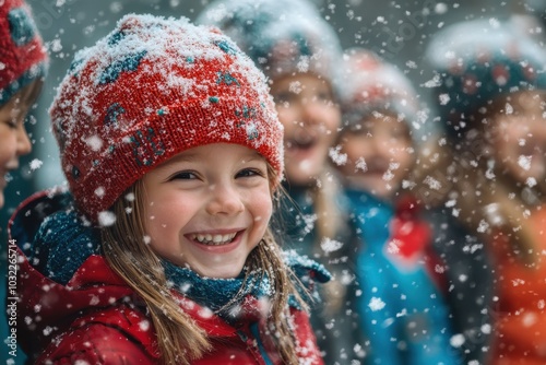 Happy child smiling in the snow, wearing a red hat and surrounded by friends.