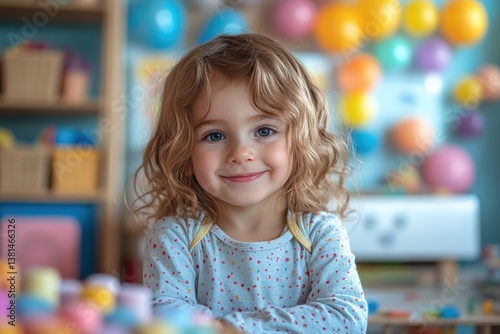 Happy child with curly hair enjoying playtime in a colorful classroom designed for small learners