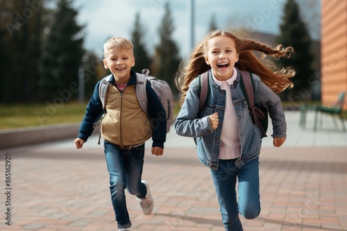 Happy children running with backpacks outdoors