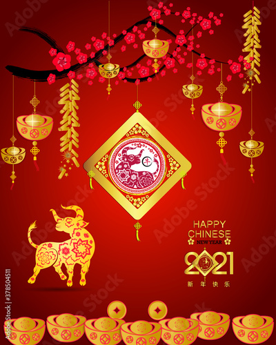 Happy chinese new year 2021 with cherry blossom flower year of the Ox
