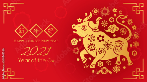 Happy Chinese New Year. The bull is a symbol of 2021, Chinese New Year. Banner template, poster, greeting cards. Chinese inscription for happiness, prosperity, longevity. Golden vector illustration.