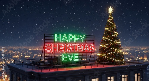 Happy christmas eve neon sign with christmas tree on rooftop overlooking city in winter snow night scene -christmas eve