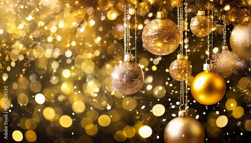 happy christmas light decorations in new year night winter background ornaments elements gold confetti bokeh color xmas ornaments glass ball tree decorations christmas glowing golden background