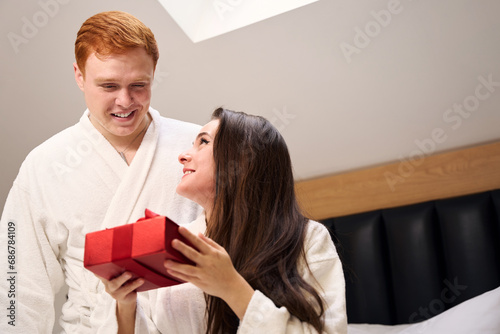 Happy couple celebrating Valentine day in modern bedroom
