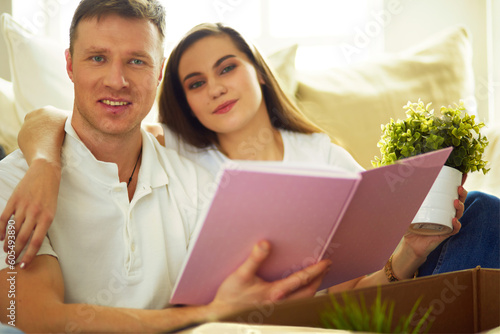 Happy couple looking at photo album while unpacking stuff after relocation to new flat