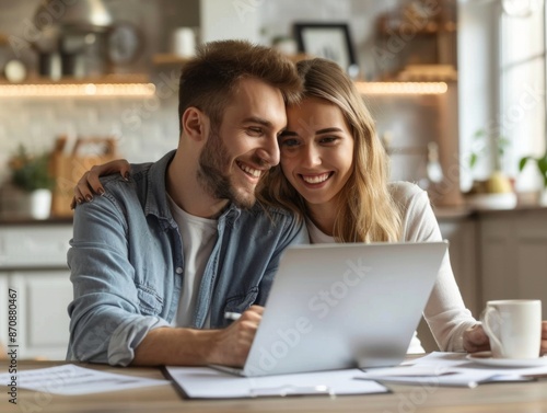 Happy couple sitting together at home, using a laptop and reviewing documents, showcasing teamwork and a positive relationship.