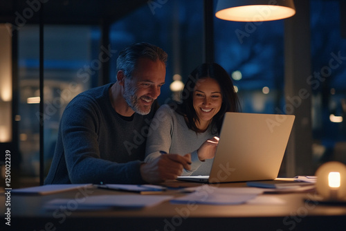 Happy couple working together on a laptop at night, discussing ideas and brainstorming in a cozy home office