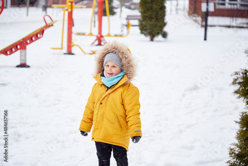 Happy cute child having fun in the snow. Enjoying winter fun outside.
