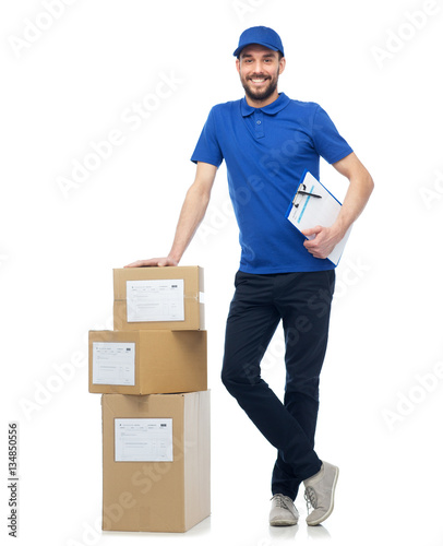 happy delivery man with parcel boxes and clipboard