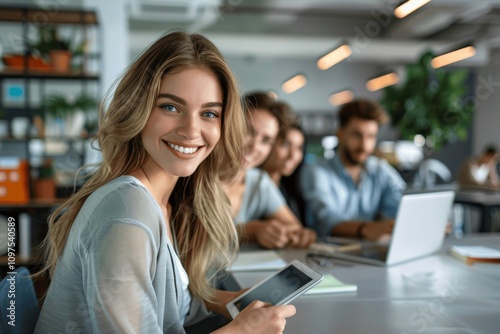 Happy diverse business team working together in modern office, smiling woman with tablet and group meeting with laptop and documents