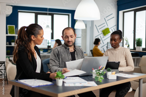 Happy diverse businesspeople analysing great annual financial reports sitting at desk using laptop. Man leader explainig project strategy using graphics, discussing project ideas, brainstorming