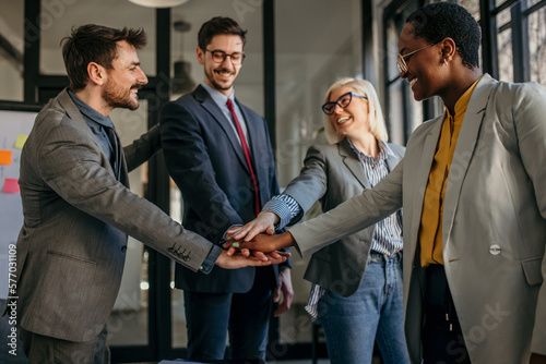 Happy diverse colleagues team people give hands on hands. Business teamwork results are motivated by business success victory loyalty unity concept, good corporate relations, and team building.