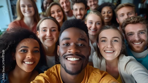 Happy, diverse people taking a group selfie portrait in the office, celebrating multicultural teamwork together, a concept of happy lifestyle.