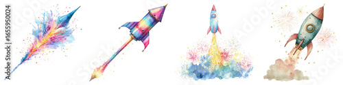 Happy diwali clipart watercolor, A collection of colorful rockets launching into the sky, each with unique designs and vibrant trails of color and sparkles.