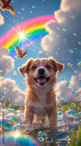 Happy dog playing in water with bubbles and a rainbow in the background.