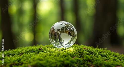 Happy Earth Day Glass sphere, crystal ball, world map, globe, forest floor, moss, blurred trees, soft focus background, ethereal, magical, nature, environmental concept, miniature world