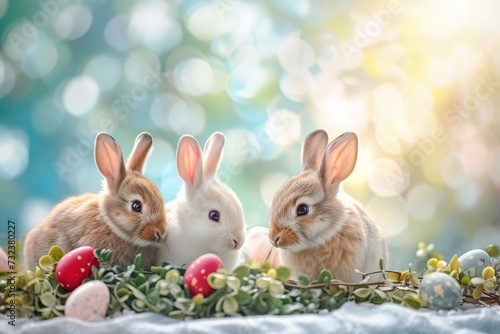 Happy Easter Eggs Basket Banana. Bunny in flower easter medley decoration Garden. Cute hare 3d easter rose easter rabbit spring illustration. Holy week muted card wallpaper render layer
