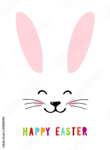 Happy easter. Holiday card with the head of a rabbit. Easter banner with a portrait of a cute bunny, cartoon character with pink ears. Vector illustration isolated on a white background.
