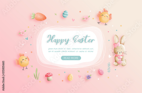 Happy Easter with cute bunny and Easter eggs in paper cut style vector illustration.