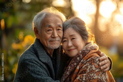Happy elderly couple with lifestyle after retiree concept. Lovely asian seniors couple embracing together in the park in the morning, Generative AI