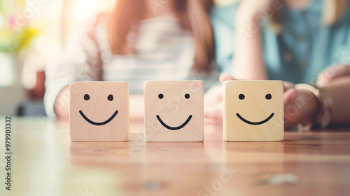 Happy faces on wooden blocks symbolize exceptional customer service and satisfaction. This image captures essence of positive interactions and joy they bring